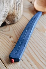 A beautiful hand carved cooking and serving spoon, large in size and made from local storm fallen cherry wood using only traditional hand tools. The spoon has been decorated with chip carved patterns and is knife finished (no sand paper used) and painted with a natural food safe durable milk paint. Sealed with a blend of organic walnut oil and beeswax. Made to be used and enjoyed.